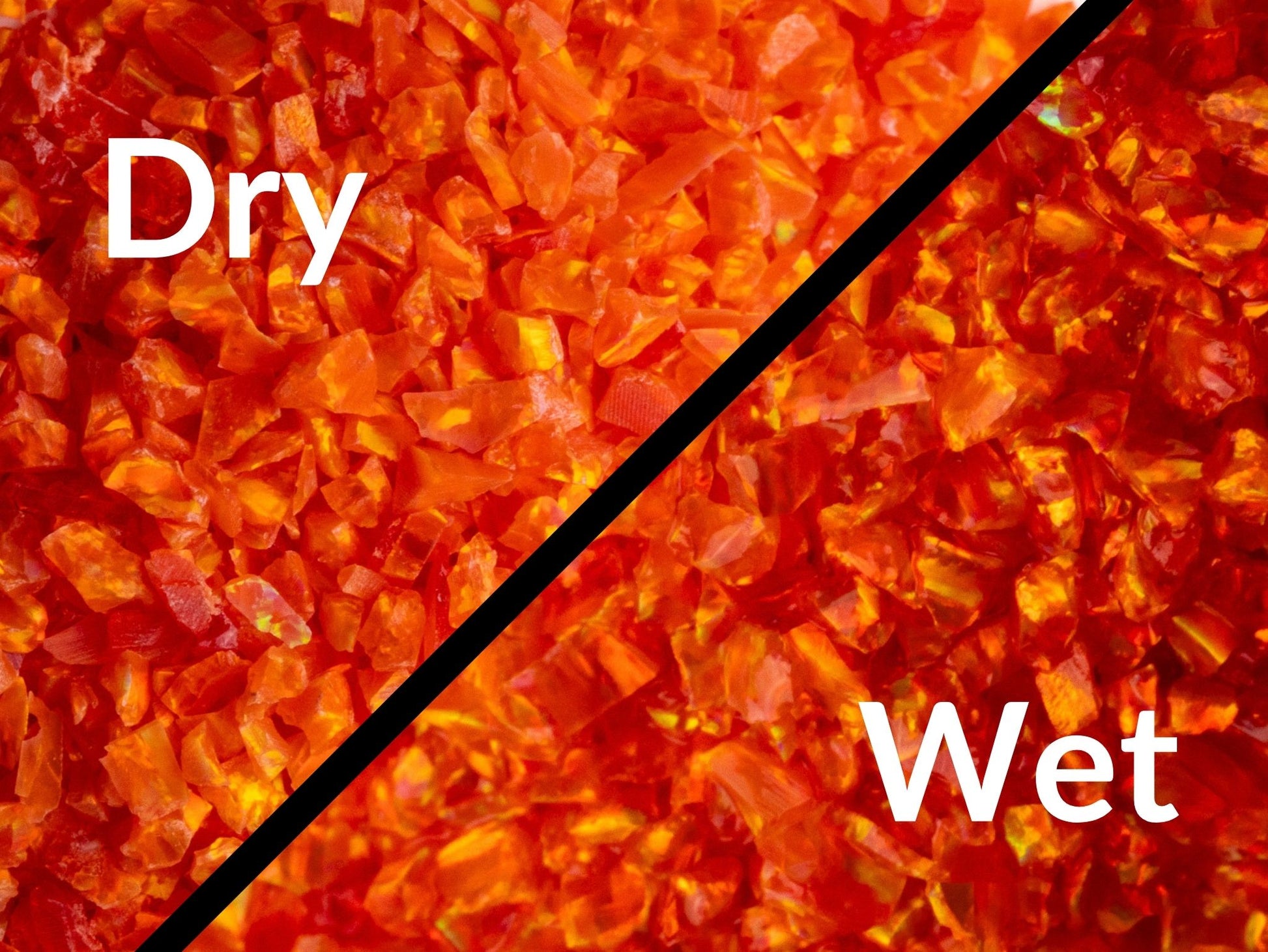 Why do we have a "wet vs dry" image for each opal? Opals are able to reflect light in an amazing way, which gives them that classic shimmer. This effect is compounded when the opals are encased in a glossy medium. The "wet vs dry" image is meant to give an insight into how the opal may appear when encased in a fully polished ring.