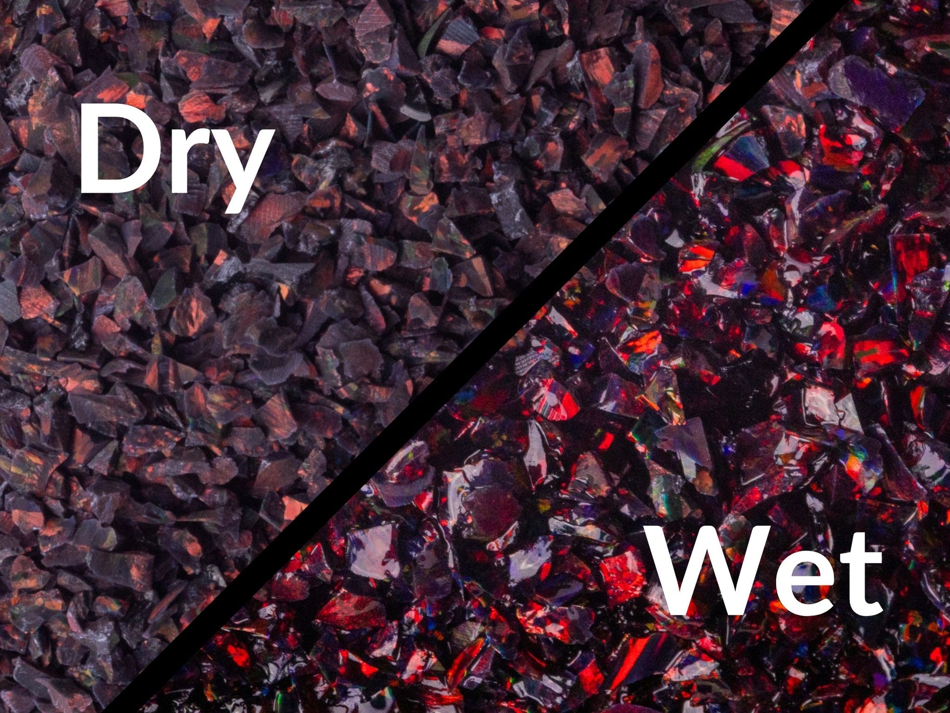 Why do we have a "wet vs dry" image for each opal? Opals are able to reflect light in an amazing way, which gives them that classic shimmer. This effect is compounded when the opals are encased in a glossy medium. The "wet vs dry" image is meant to give an insight into how the opal may appear when encased in a fully polished ring.
