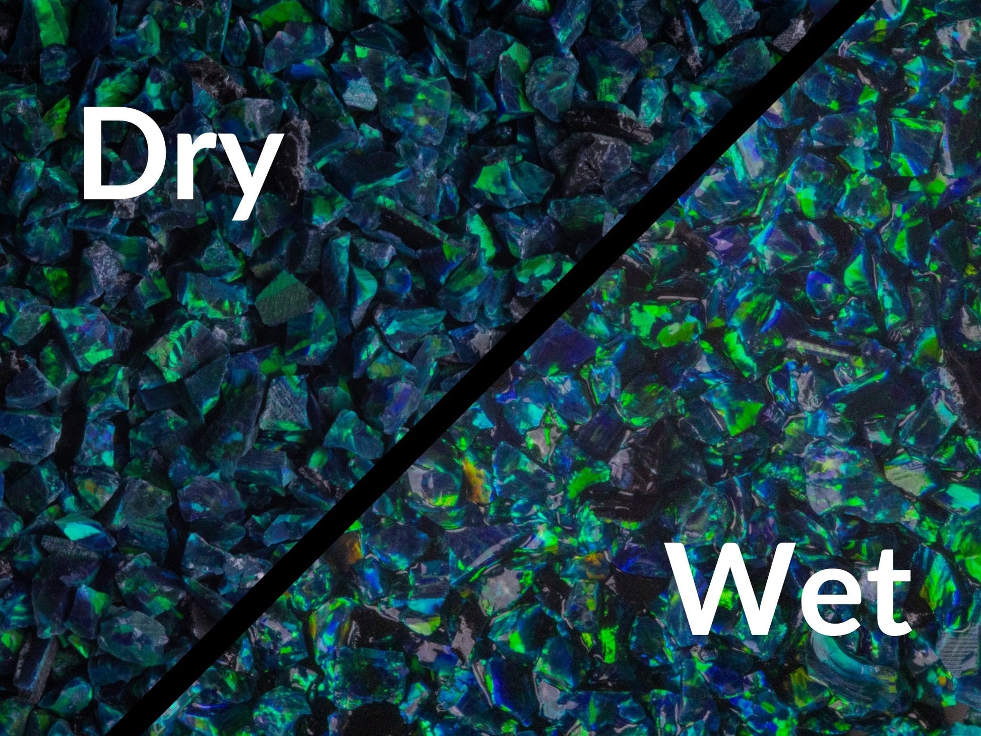 Why do we have a "wet vs dry" image for each opal? Opals are able to reflect light in an amazing way, which gives them that classic shimmer. This effect is compounded when the opals are encased in a glossy medium. The "wet vs dry" image is meant to give an insight into how the opal may appear when encased in a fully polished ring.