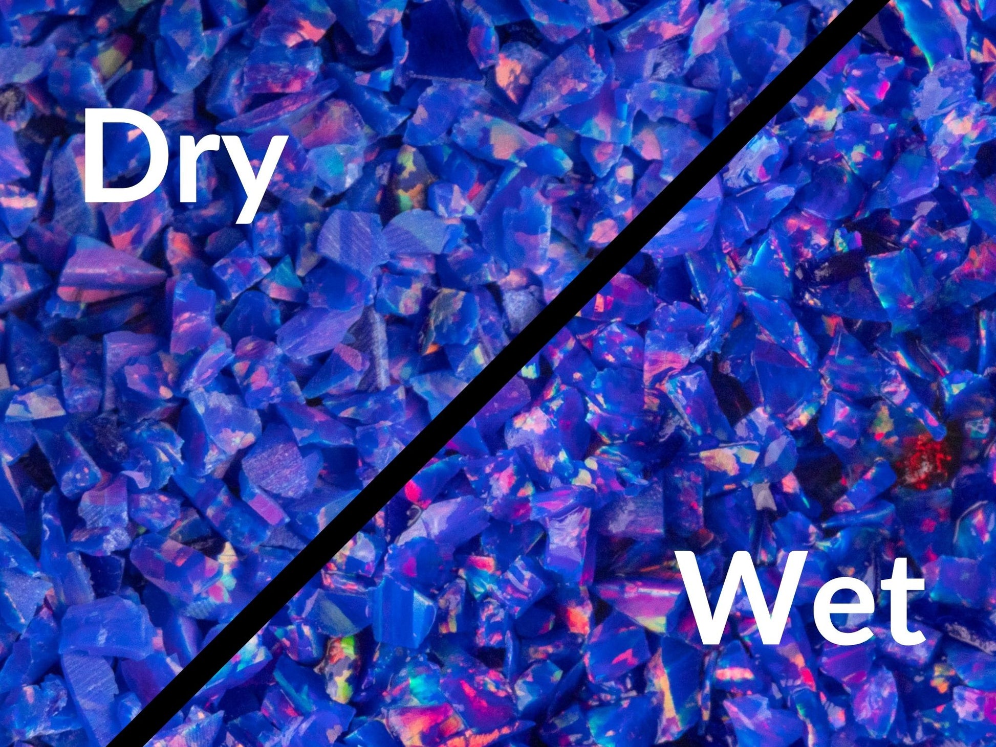 Why do we have a "wet vs dry" image for each opal? Opals are able to reflect light in an amazing way, which gives them that classic shimmer. This effect is compounded when the opals are encased in a glossy medium. The "wet vs dry" image is meant to give an insight into how the opal may appear when encased in a fully polished ring.