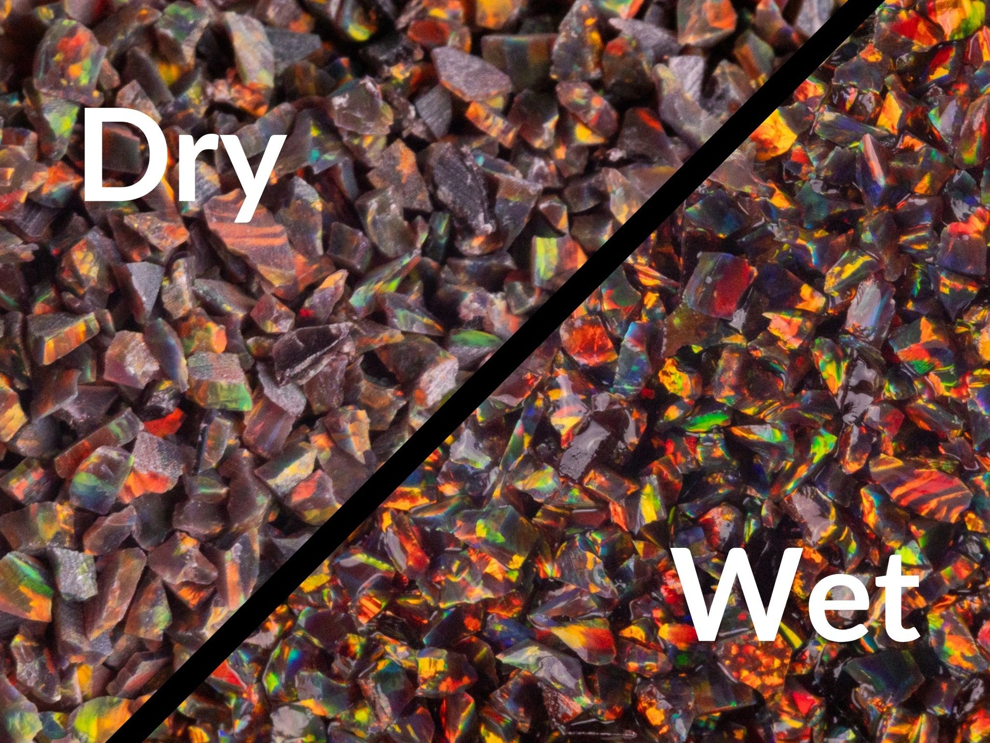 Why do we have a "wet vs dry" image for each opal? Opals are able to reflect light in an amazing way, which gives them that classic shimmer. This effect is compounded when the opals are encased in a glossy medium. The "wet vs dry" image is meant to give an insight into how the opal may appear when encased in a fully polished ring.