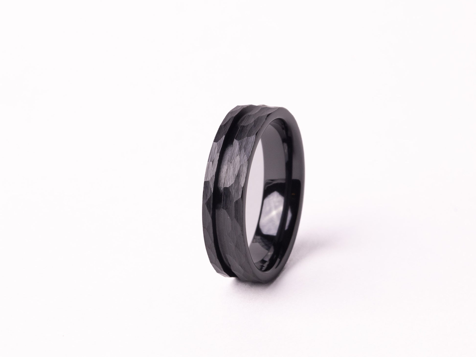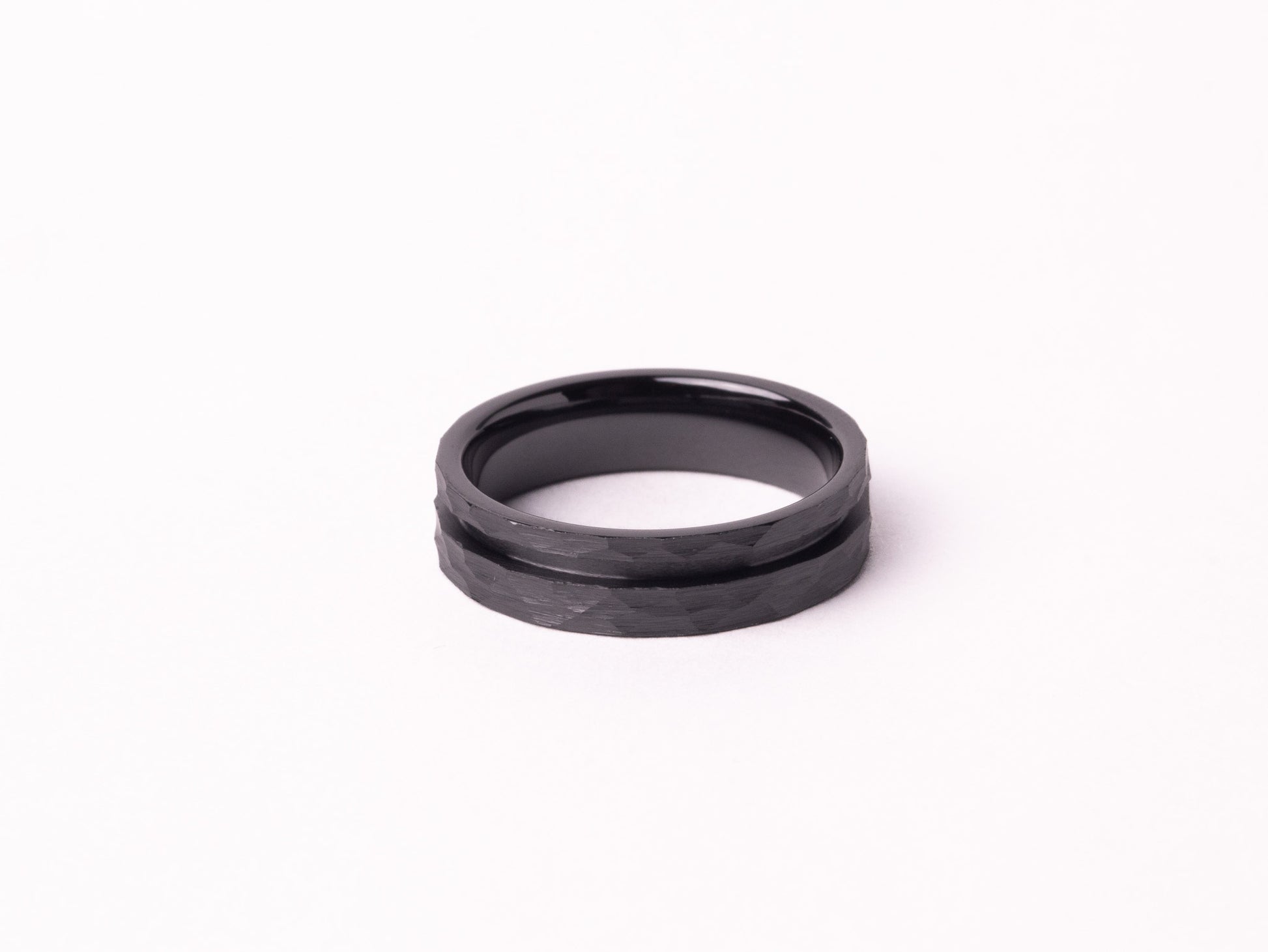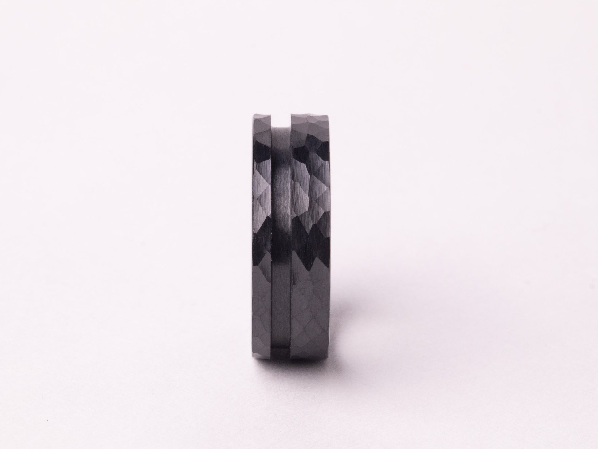 Offset hammered black ceramic ring core for inlays. 8mm and 6mm width available with 4mm wide and 3mm wide channels respectively.