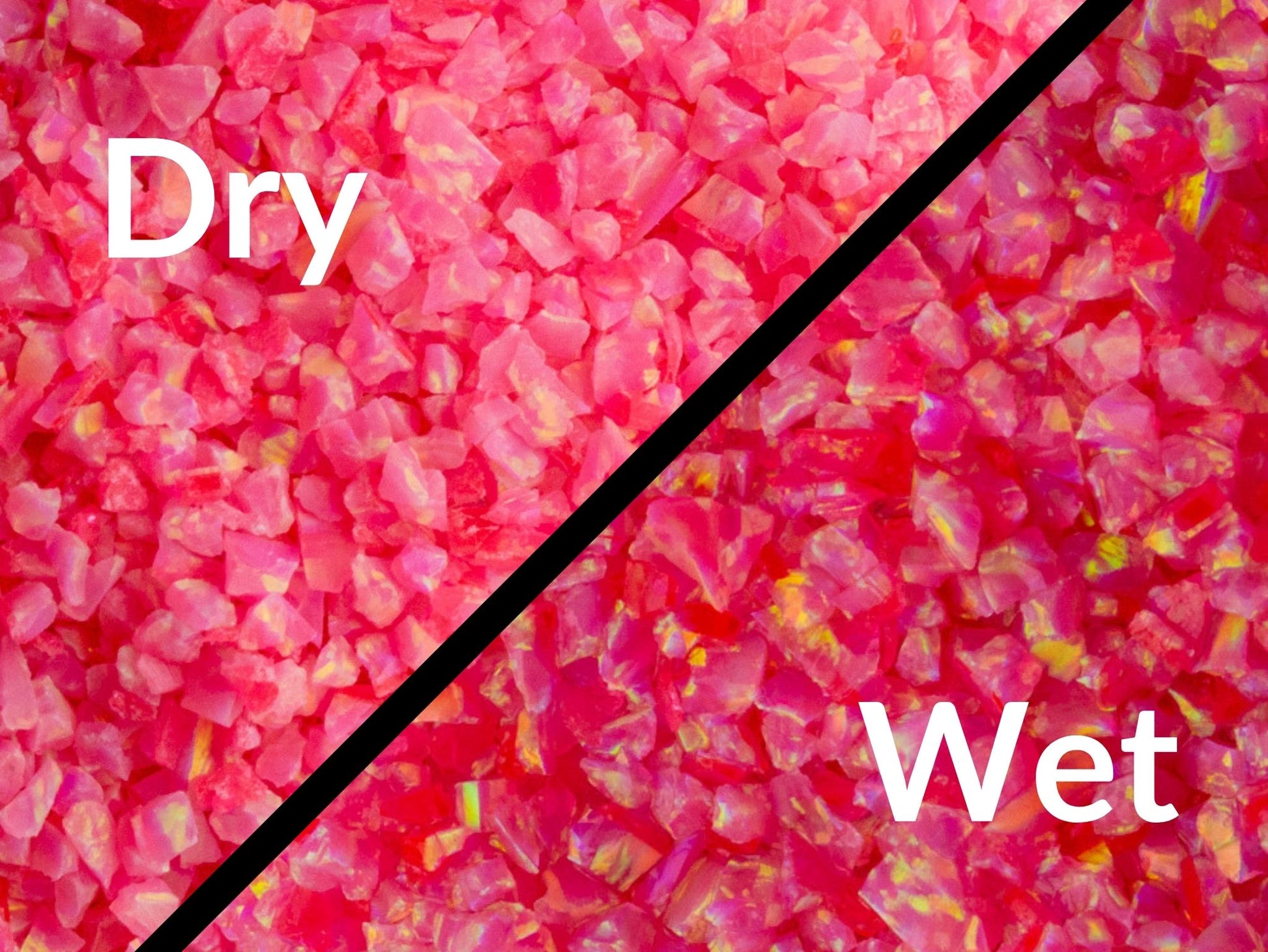 Why do we have a "wet vs dry" image for each opal? Opals are able to reflect light in an amazing way, which gives them that classic shimmer. This effect is compounded when the opals are encased in a glossy medium. The "wet vs dry" image is meant to give an insight into how the opal may appear when encased in a fully polished ring.