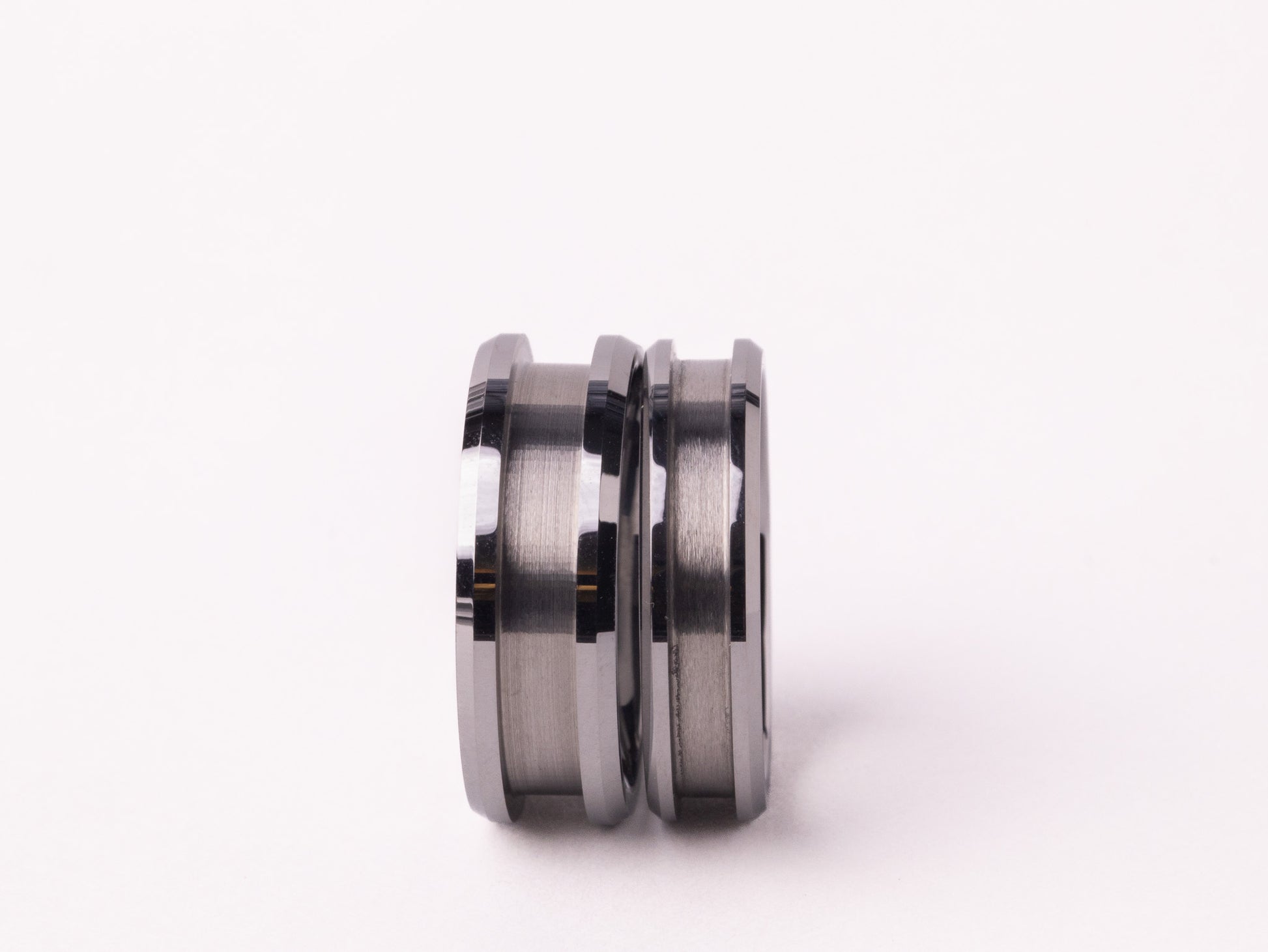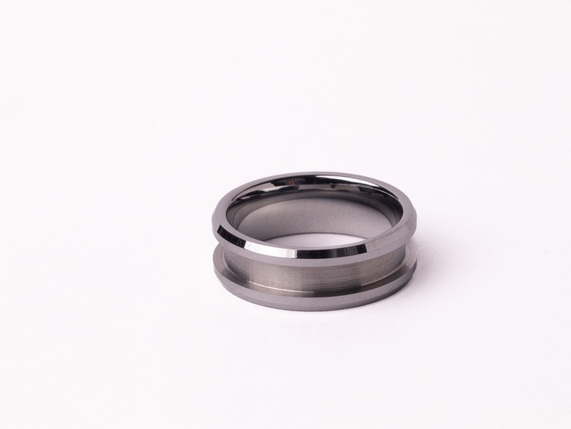 Smooth beveled tungsten carbide ring core for inlays. 8mm and 6mm width available with 4mm wide and 3mm wide channels respectively.